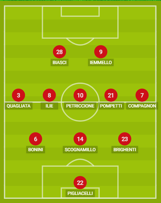 CATANZARO (3-5-2): 22 Pigliacelli; 23 Brighenti, 14 Scognamillo, 6 Bonini; 7 Compagnon, 21 Pompetti, 10 Petriccione, 8 Ilie, 3 Quagliata; 9 Iemmello, 28 Biasci. A disposizione: 25 Gelmi, 99 Borrelli, 4 Antonini, 84 Cassandro, 20 Pontisso, 24 Pagano, 19 La Mantia, 29 Seck, 45 Buso, 70 D’Alessandro, 90 Pittarello. Allenatore: Caserta.