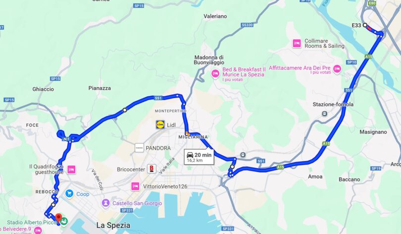 Potete utilizzare questo percorso maps, creato seguendo le indicazioni (vedi copertina): Da casello La Spezia a Stadio Alberto Picco per i tifosi ospiti