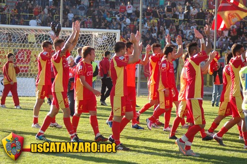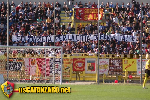 C’è vento oggi a Catanzaro. Non è quello freddo di Aversa, ma sempre vento è; e come spesso accade al “Ceravolo” anche la partita ne è condizionata. Noi scendiamo in campo in maglia rossa, con la fascia gialla sui lati, loro indossano una maglia bianca che sembra la nostra dell’ultima trasferta in Campania. La curva con uno striscione esprime solidarietà agli amici di Barletta per la tragedia che li ha visti coinvolti di recente.