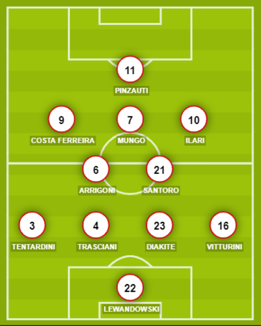 TERAMO (4-2-3-1): 22 Lewandowski; 16 Vitturini, 23 Diakite, 4 Trasciani, 3 Tentardini; 21 Santoro, 6 Arrigoni; 10 Ilari, 7 Mungo, 9 Costa Ferreira; 11 Pinzauti. A disposizione: 12 D’Egidio, 19 Bellucci, 17 Di Francesco, 28 Viero, 35 Lombardi, 24 Persiani, 29 Kyeremateng, 36 Gerbi. Allenatore: Paci.