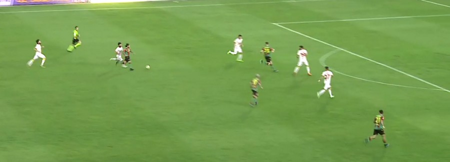 Nella prima mezz’ora Corapi giocava avanzato e Carlini tornava dietro per impostare la manovra. Il primo ha tolto spessore al centrocampo, il secondo ha tolto peso in attacco. Nessuno dei due ha dato quel valore aggiunto che Calabro sperava di ottenere per superare la fase di pressing dei padroni di casa.