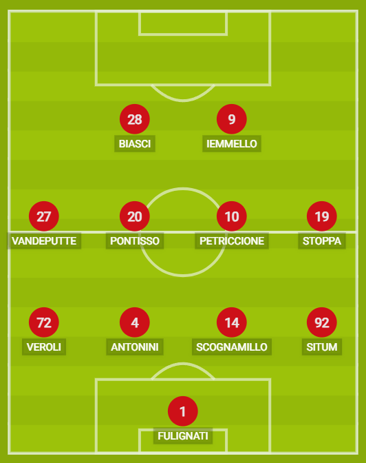 Indisponibili: D’Andrea, Ghion, Brighenti, Ambrosino. Squalificati: Sounas. Diffidati: Petriccione, Scognamillo.