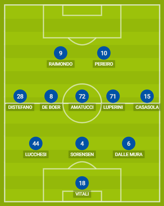 TERNANA (3-5-2): 18 Vitali; 6 Dalle Mura, 4 Sorensen, 44 Lucchesi; 15 Casasola, 71 Luperini, 72 Amatucci, 8 De Boer; 10 Pereiro; 28 Distefano, 9 Raimondo. A disposizione: 22 Franchi, 76 Novelli, 2 Bonugli, 3 Zoia, 79 Carboni, 16 Faticanti, 21 Ferrara, 24 Viviani, 25 Labojko, 27 Favasuli, 65 Dionisi. Allenatore: Breda.