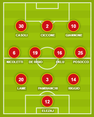 CATANZARO (3-4-3): 12 Elezaj; 14 Riggio, 3 Pambianchi, 20 Lame; 25 Posocco, 16 Eklu, 19 De Risio, 6 Nicoletti; 10 Giannone, 2 Ciccone, 30 Casoli. A disposizione: 1 Furlan, 22 Mittica, 13 Favalli, 18 Nikolopoulos, 4 Maita, 8 Iuliano, 7 D’Ursi. Allenatore: Auteri.