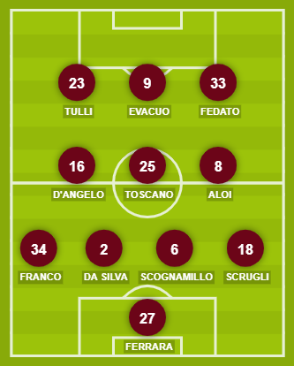 TRAPANI (4-3-3): 27 Ferrara; 18 Scrugli, 6 Scognamillo, 2 Da Silva, 34 Franco; 8 Aloi, 25 Toscano, 16 D’Angelo; 33 Fedato, 9 Evacuo, 23 Tulli. A disposizione: 1 Dini, 12 Ingrassia, 22 Cavalli, 4 Pagliarulo, 26 Lomolino, 5 Taugourdeau, 10 Costa Ferreira, 19 Corapi, 28 Mastaj, 31 Valenti, 7 Ferretti, 20 Dambros. Allenatore: Italiano.