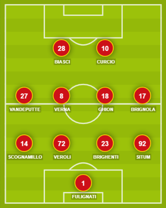 CATANZARO (4-4-2): 1 Fulignati; 92 Situm, 23 Brighenti, 72 Veroli, 14 Scognamillo; 17 Brignola, 18 Ghion, 8 Verna, 27 Vandeputte; 10 Curcio, 28 Biasci. A disposizione: 16 Sala, 22 Borrelli, 5 Krastev, 6 Welbeck, 20 Pontisso, 21 Pompetti, 24 Sounas, 33 Oliveri, 77 Katseris, 7 D’Andrea, 25 Bombagi. Allenatore: Vivarini.