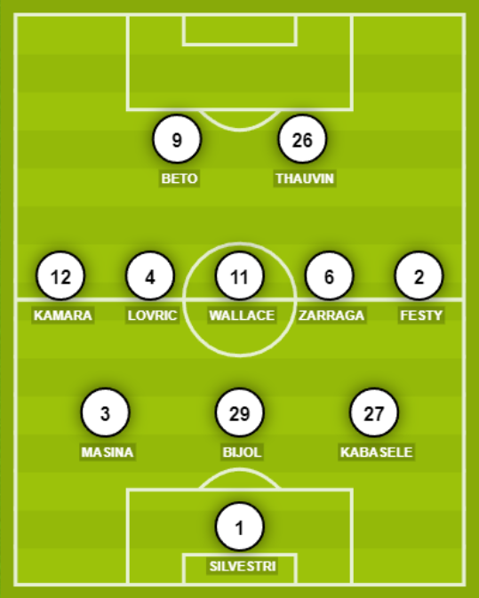 Sottil riparte dal 3-5-2. Squalificato Perez, davanti a Silvestri saranno Kabasele, Bijol e Masina ad agire sulla linea difensiva. A centrocampo Zarraga, Wallace e Lovric, con Festy a destra ed uno tra Kamara e Zemura sulla corsia opposta. Out Deulofeu, in avanti toccherà a Thauvin fare coppia con Beto. Convocato il neo acquisto Aké che andrà in panchina.