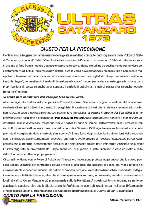 Pur ipotizzando che questa polemica abbia la sua valenza ed auspicando che possa sortire, vista la rapidità decisionale di questo assurdo paese, qualche effetto in un remoto futuro, a chi o cosa pensate che possa servire questa protesta in un immediato presente? Io credo che contribuisca, ed in modo nettamente concreto, solo ed esclusivamente al male del nostro Catanzaro… Il bastardo del padrone ci ha dato in mano le armi per ucciderci da soli e non lo vogliamo capire!!! Non siamo più negli anni ’70, le proteste oggi sono belle che veicolate dal sistema e vanno fatte con la testa!!!