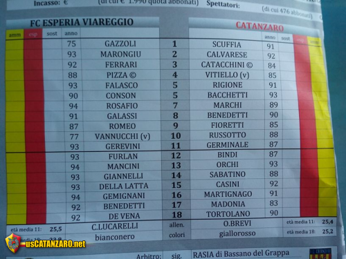 CATANZARO (4-3-3): Scuffia; Calvarese, Rigione, Bacchetti, Catacchini; Marchi, Vitiello, Benedetti A.; Germinale, Fioretti, Russotto. A disposizione: Bindi, Orchi, Sabatino, Casini, Martignago, Madonia, Tortolano. All.: Brevi.