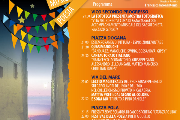 La manifestazione, patrocinata dall’Assessorato alla Cultura e dall’assessorato al Turismo del Comune di Catanzaro, si svolgerà mercoledì 12 agosto nei vicoli del Quartiere Marinaro ed avrà come protagonisti l’arte, la musica e la poesia.