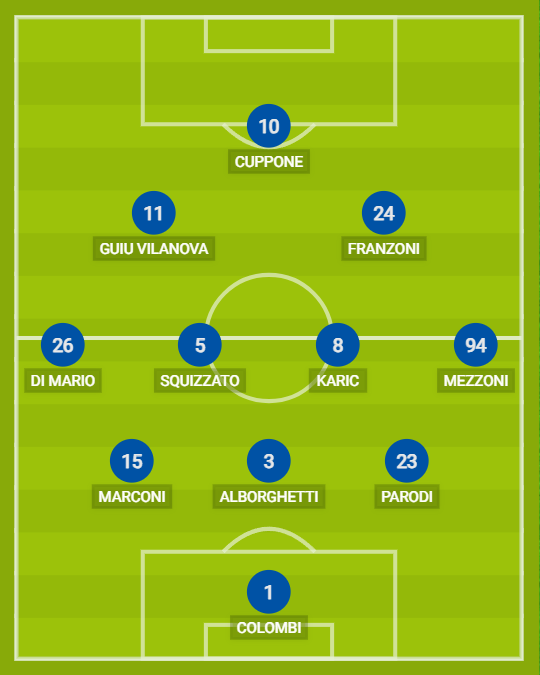 VIRTUS ENTELLA (3-4-2-1): 1 Colombi; 23 Parodi, 3 Alborghetti, 15 Marconi; 94 Mezzoni, 8 Karic, 5 Squizzato, 26 Di Mario; 24 Franzoni, 11 Guiu Vilanova; 10 Cuppone. A disposizione: 22 Del Frate, 99 Sialulys, 38 Pilati, 46 Turicchia, 57 Del Lungo, 7 Bariti, 27 Della Vecchia, 32 Benedetti, 77 Boccadamo, 9 Stabile, 17 Tirelli, 19 Debenedtti. Allenatore: Chiappella.